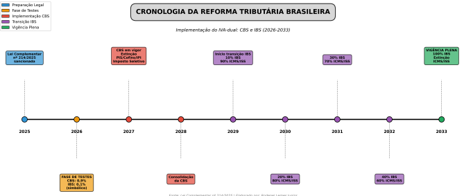 Gráfico : Linha do tempo detalhada da implementação da Reforma Tributária, destacando os principais marcos de 2025 a 2033.