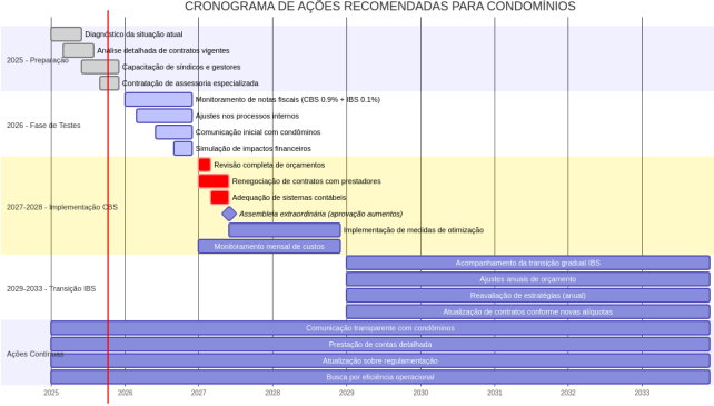2027-2028 (Implementação da CBS): Com a entrada em vigor efetiva da CBS, será necessário revisar completamente os orçamentos, renegociar contratos com prestadores de serviços e adequar os sistemas contábeis. A realização de assembleias extraordinárias para aprovação de aumentos nas taxas condominiais será inevitável, e a implementação de medidas de otimização de despesas deve ser intensificada.